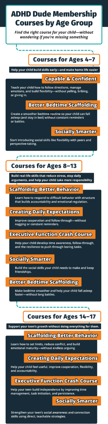 Each course builds on the ADHD Dude Method, giving you clear, practical strategies for improving behavior, strengthening social skills, and improving executive function.