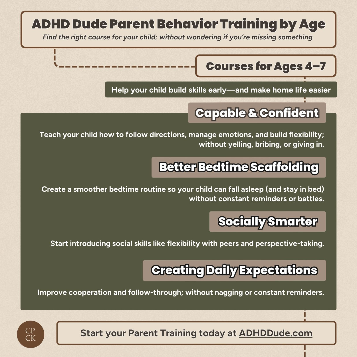 Parent Behavior Training for ages 4–7 — designed to give you the foundation the American Academy of Pediatrics recommends for improving behavior in kids with ADHD.